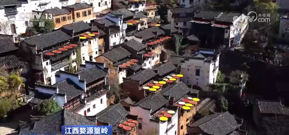 在江西婺源篁嶺,多種農產品和徽派建筑對比鮮明,共同構成了婺源獨特的“曬秋”景觀。優(yōu)質的生態(tài)環(huán)境孕育了“紅、綠、黑、白、黃”五大特色物產,“曬秋”成為“中國最美鄉(xiāng)村”的特有名片。