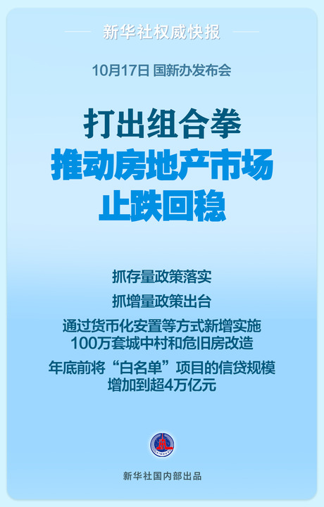 17日,國(guó)新辦發(fā)布會(huì)引起市場(chǎng)高度關(guān)注。住房城鄉(xiāng)建設(shè)部、財(cái)政部、自然資源部、中國(guó)人民銀行、國(guó)家金融監(jiān)督管理總局五部門有關(guān)負(fù)責(zé)人齊亮相,推出增量舉措,落實(shí)存量政策,打出一套組合拳,推動(dòng)房地產(chǎn)市場(chǎng)止跌回穩(wěn)。