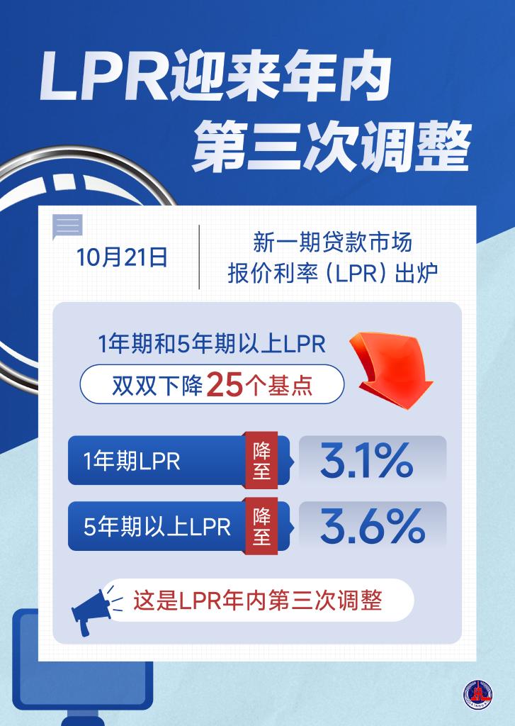 10月21日,新一期貸款市場報價利率(LPR)發布,1年期和5年期以上LPR雙雙下降25個基點,1年期LPR降至3.1%,5年期以上LPR降至3.6%。