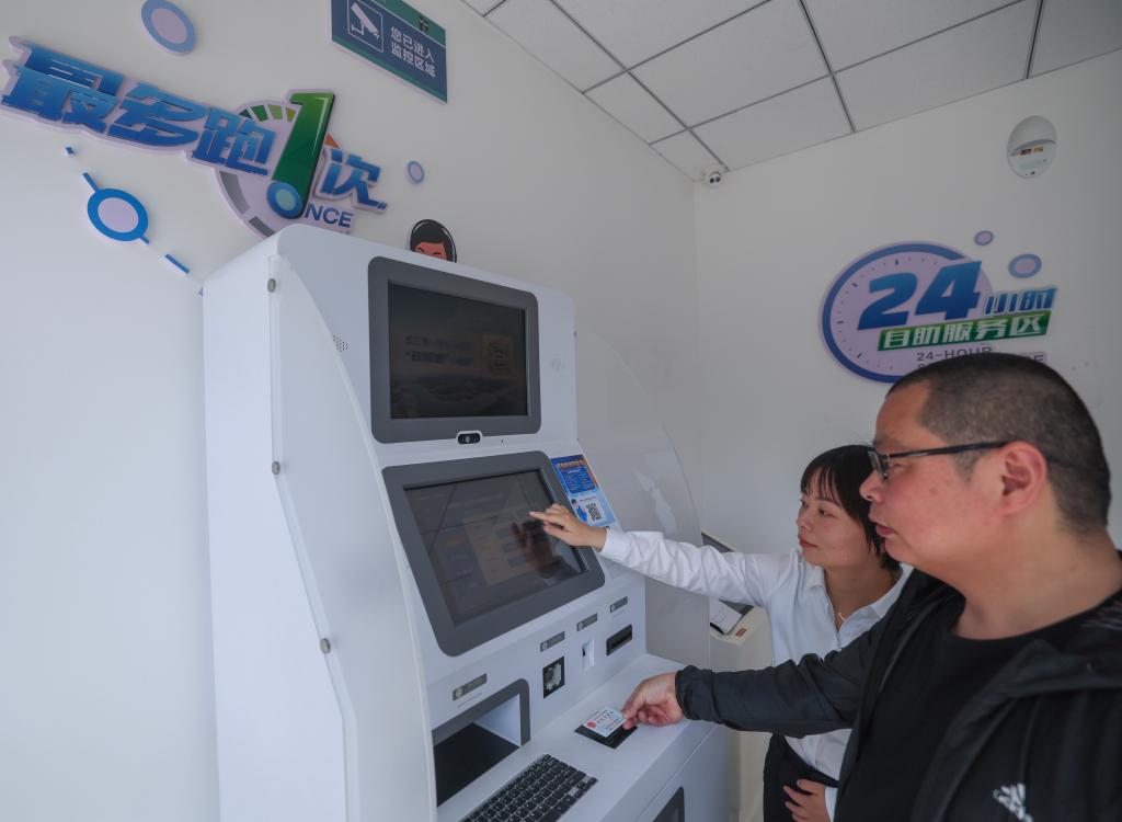 2024年5月9日,在浙江省嘉興市秀洲區王江涇鎮便民服務中心,工作人員指導居民對在蘇州工作期間的社保繳費記錄進行自助跨省查詢。新華社記者 徐昱 攝