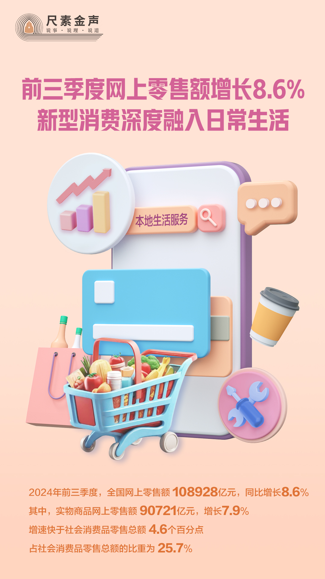 最新數據顯示,今年前三季度,全國網上零售額108928億元,同比增長8.6%。其中,實物商品網上零售額90721億元,增長7.9%,增速快于社會消費品零售總額4.6個百分點,占社會消費品零售總額的比重為25.7%。本地生活服務等新型消費快速增長,對線上消費增長起到明顯的拉動作用。