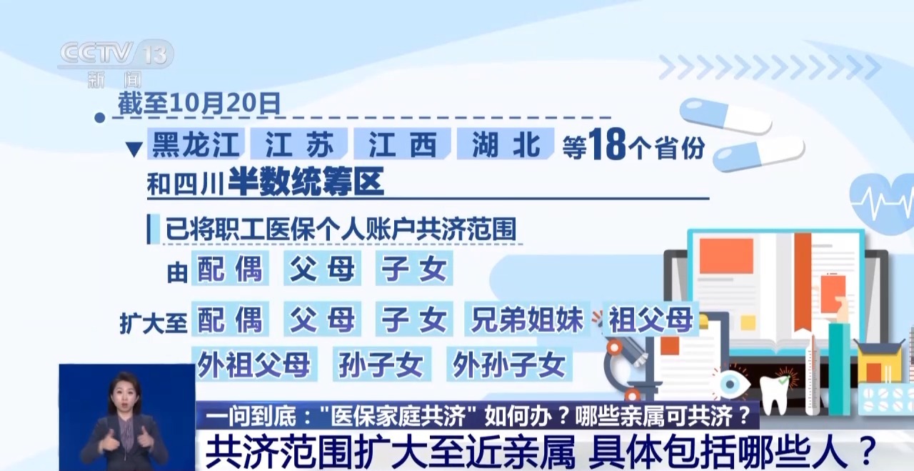 截至10月20日,黑龍江、江蘇、江西、湖北等18個省份及四川半數統籌區已將職工醫保個人賬戶共濟范圍由“配偶、父母、子女”擴大至“配偶、父母、子女、兄弟姐妹、祖父母、外祖父母、孫子女、外孫子女”。