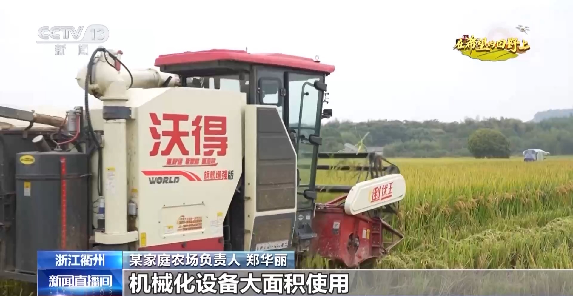 在衢州柯城區的一片稻田里,金黃的晚稻成塊連片,串串稻穗顆粒飽滿,壓彎了稻稈,收割機在田間穿梭。農場負責人介紹,今年他們加大了機械化設備的使用比例,提升了種植效益。