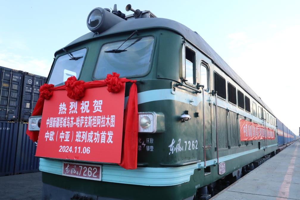 11月6日,在新疆塔城地區烏蘇鐵路貨場,中國新疆塔城烏蘇—哈薩克斯坦阿拉木圖中歐(中亞)班列首發。新華社記者 初杭 攝