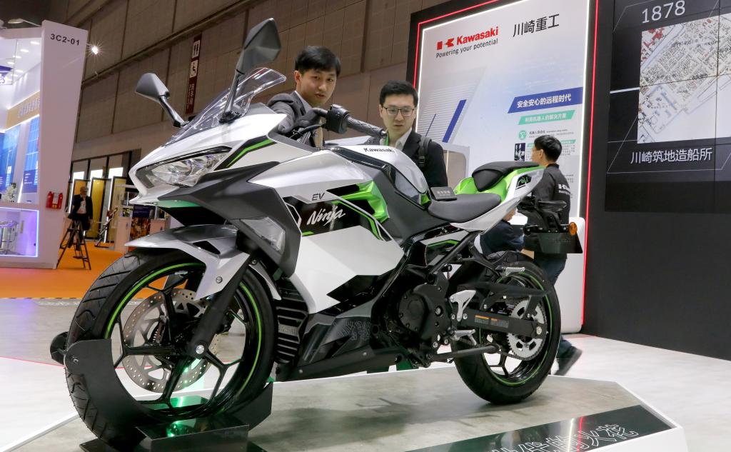 11月6日,工作人員(左)在川崎公司展臺為參觀者介紹一款電動摩托車。這是該產品在進博會上的首展。新華社記者 方喆 攝