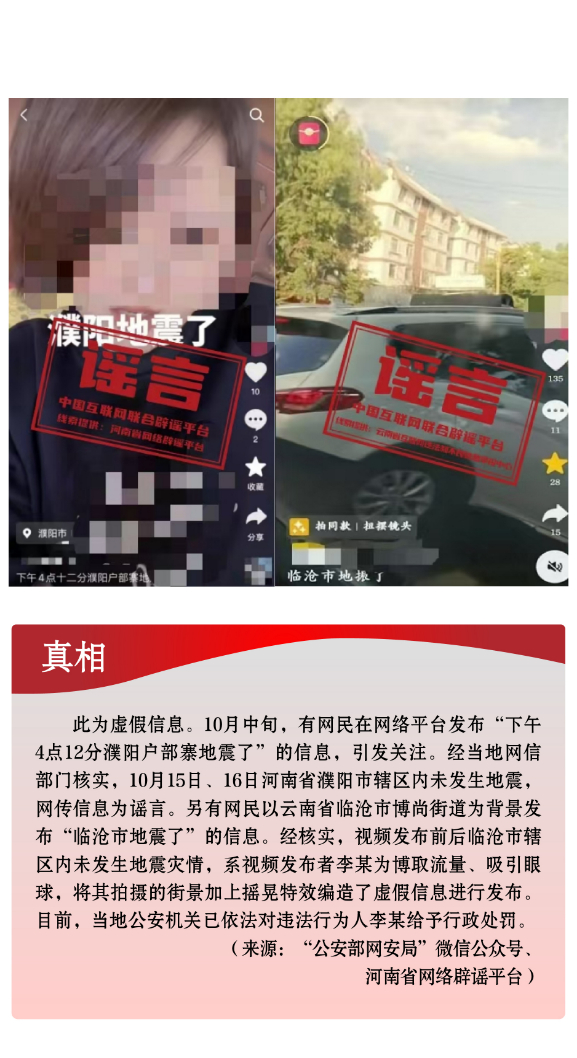 危言聳聽炒作話題。個別網(wǎng)民和自媒體編造虛假信息,炒作社會熱點話題,并配以具有煽動性、誤導(dǎo)性的標題,擴散傳播,擾亂社會秩序。10月中旬,新疆喀什、阿克蘇地區(qū)相繼發(fā)生地震,部分自媒體罔顧事實,利用AI技術(shù)拼湊網(wǎng)絡(luò)舊圖,編造完全與事實不符的地震廢墟或災(zāi)后救援圖片,混淆視聽,嚴重誤導(dǎo)網(wǎng)民。另有個別網(wǎng)民將拍攝的街景加上搖晃特效,惡意杜撰云南發(fā)生地震,引發(fā)公眾恐慌,造成不良影響。還有網(wǎng)民為給網(wǎng)店營銷引流,利用家長們高度關(guān)注兒童安全話題的心理,無中生有編造“四川巴中頻繁有青少年失蹤”謠言,引發(fā)公眾焦慮恐慌。
