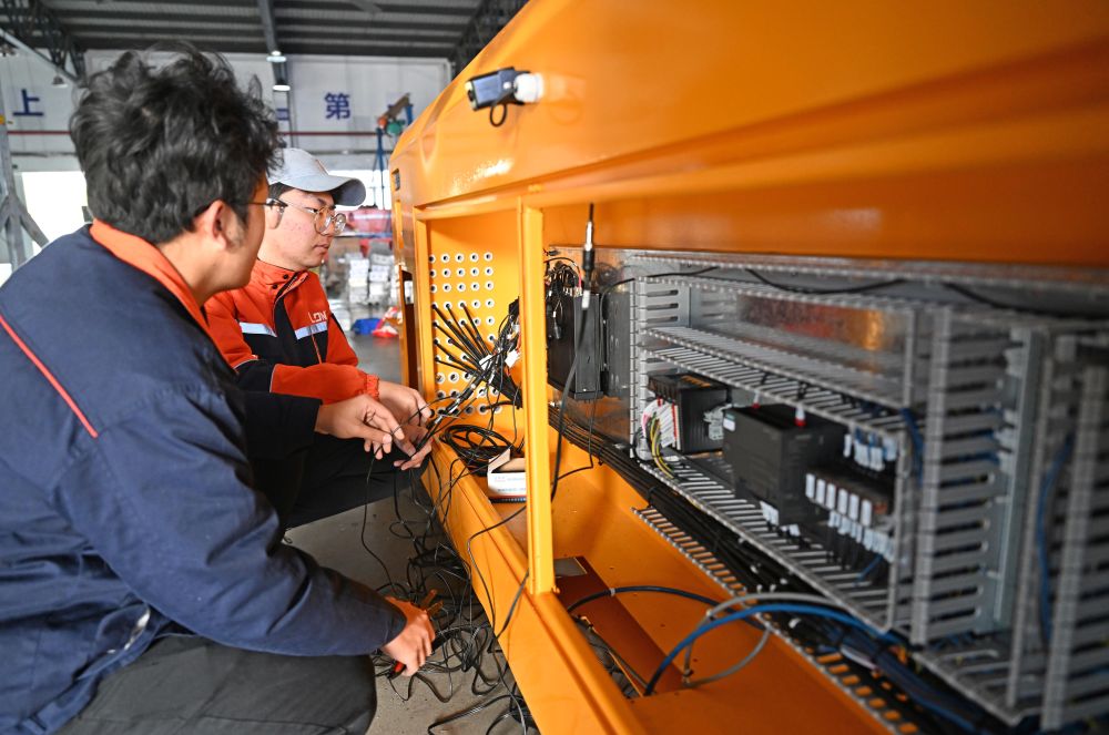 在位于天津市西青區的天津朗譽機器人有限公司生產車間內,工作人員在調試重載自動導引運輸車。新華社記者 趙子碩 攝