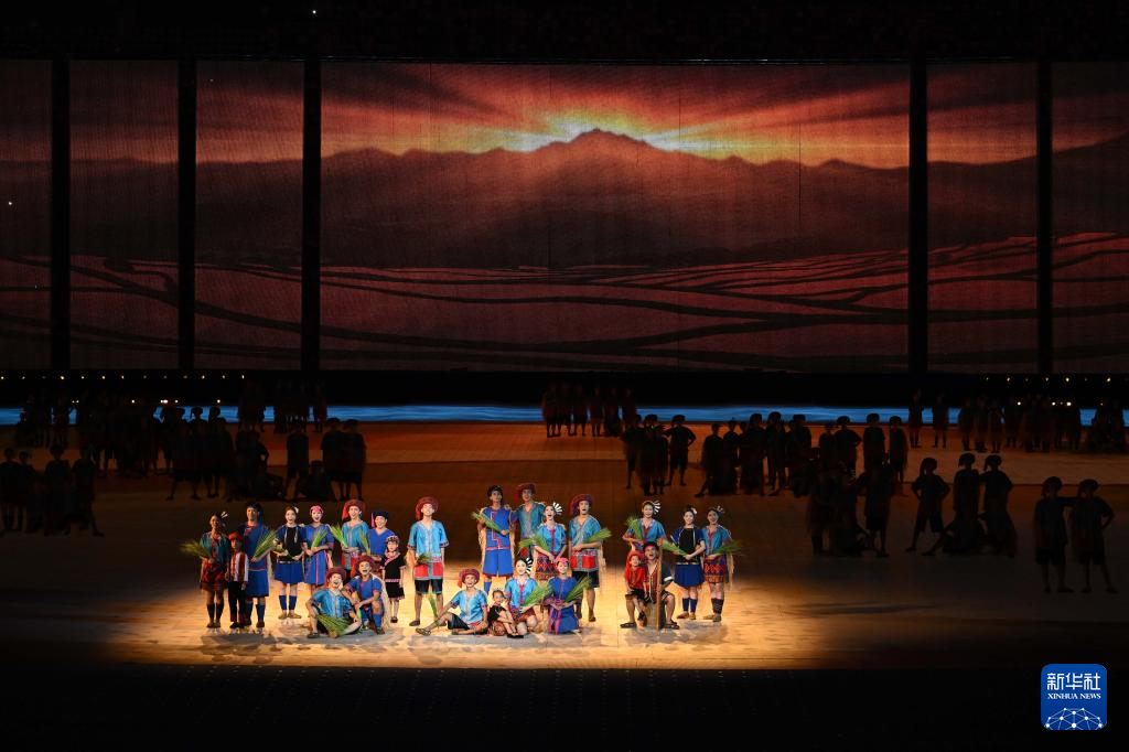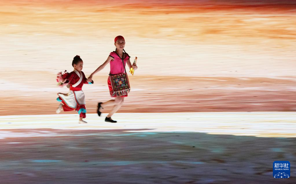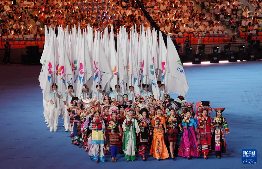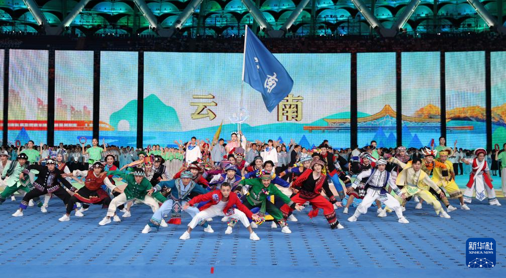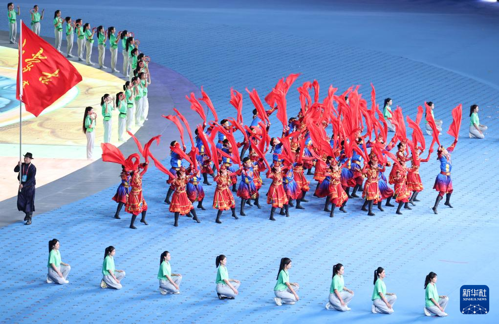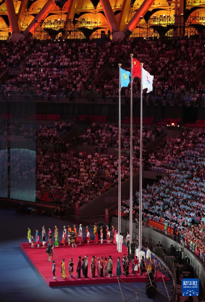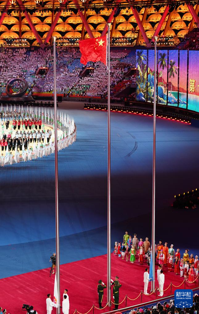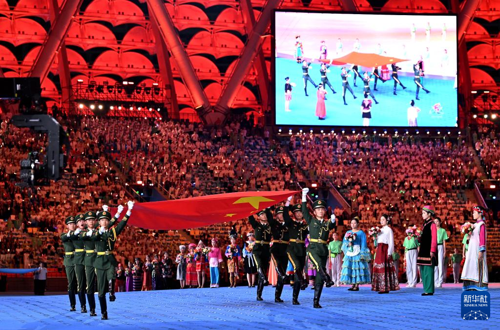 11月22日,開幕式現場升起中華人民共和國國旗、中華人民共和國少數民族傳統體育運動會會旗和中華人民共和國第十二屆少數民族傳統體育運動會會旗。