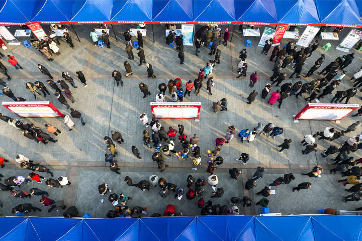 2023年1月31日,在四川省閬中市人民廣場,求職者參加東西部勞務協作暨春風行動大型招聘會(無人機照片)。新華社發(王玉貴 攝)