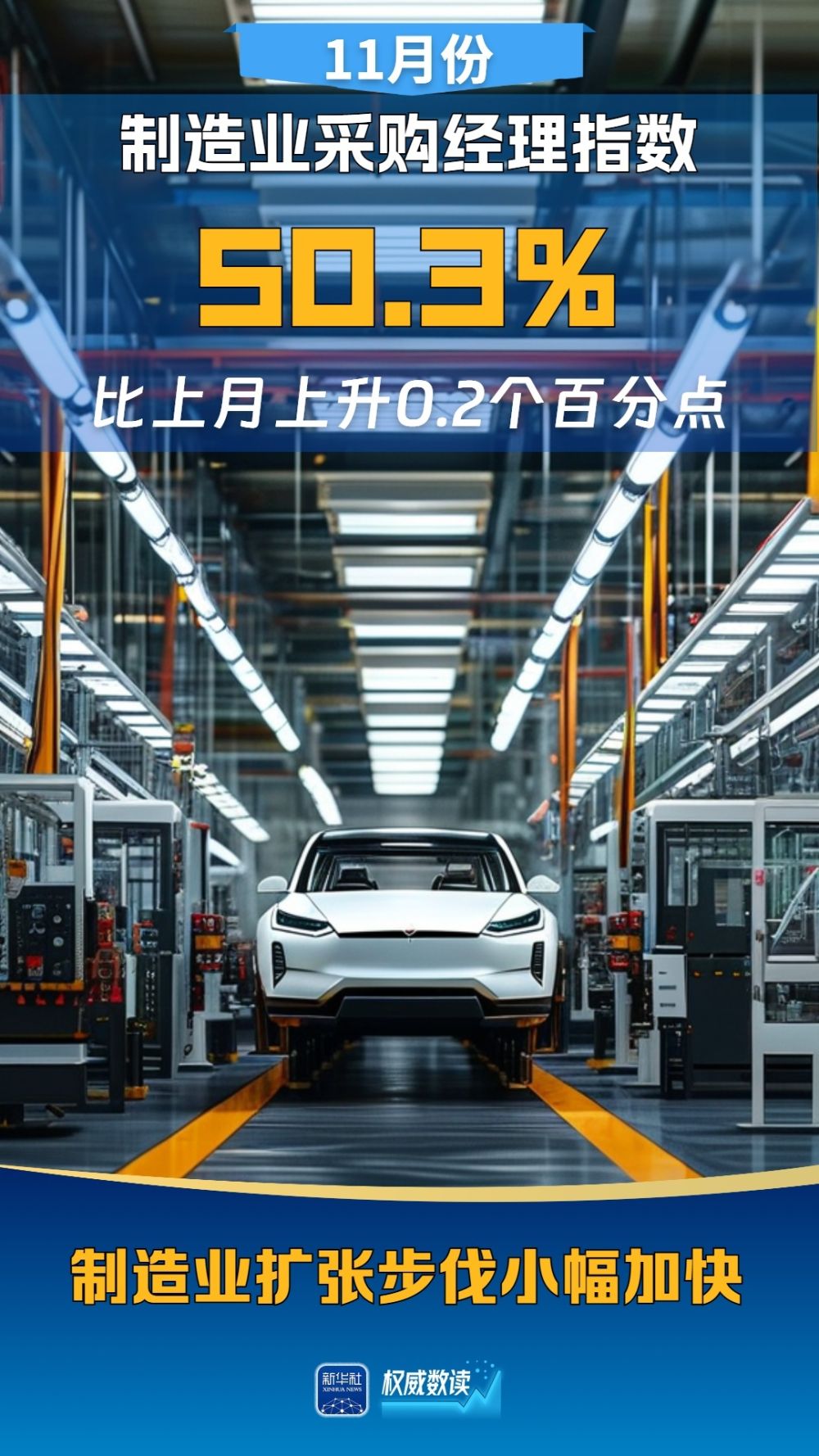 國家統計局30日發布中國采購經理指數。11月份,隨著一系列存量政策和增量政策持續協同發力,制造業PMI在景氣區間上行,升至50.3%,擴張步伐有所加快;非制造業商務活動指數為50.0%,比上月下降0.2個百分點,位于臨界點;綜合PMI產出指數為50.8%,與上月持平,表明我國企業生產經營活動總體繼續擴張。