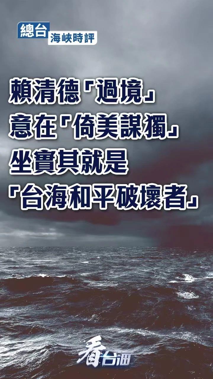 賴清德深知“過境”美國必然遭到大陸方面堅決反對、有力反制,只會加劇臺海緊張局勢。因此,在其行前賴當局就勾連外部勢力在國際上造勢,妄圖以所謂“慣例說”將此行正當化,掩蓋其挑釁在先、破壞和平的惡劣本質。臺灣是中國的臺灣,臺灣地區領導人以任何名義任何理由“過境”美國,都是對一個中國原則的嚴重挑戰。錯誤的所謂“慣例”不僅不是正當化的理由,還是錯上加錯、惡上加惡,一步步把臺灣推向更加危險的境地。