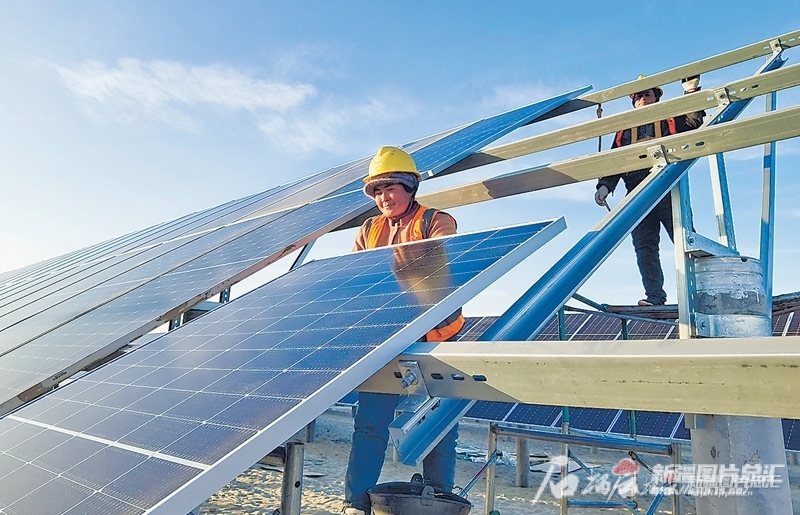 12月1日,位于和田市吉亞鄉的華潤新能源50萬千瓦光伏治沙項目施工現場一派熱火朝天景象。該項目總投資約15億元,預計明年5月底實現全容量投產。圖為工人在鋪設光伏板。 石榴云/新疆日報記者 湯永攝