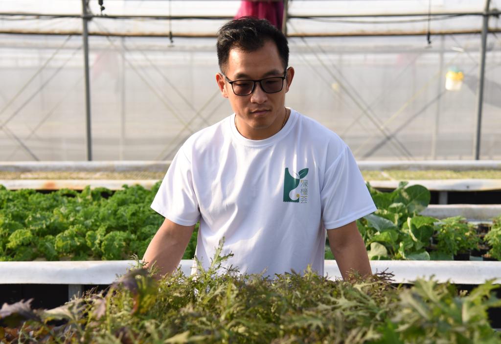 在珠海市金灣區紅旗鎮的一處農場,翠綠的菜葉盡情伸展,工人們正利用流水線快速采摘成熟的蔬菜。澳門青年孫振鴻和合作伙伴穿著雨靴在大棚中忙碌。