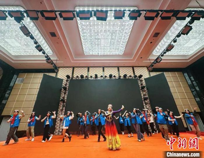 圖為參加交流團(tuán)的香港青年(藍(lán)衣)跟隨當(dāng)?shù)孛癖妼W(xué)習(xí)新疆特色舞蹈。 主辦方 供圖