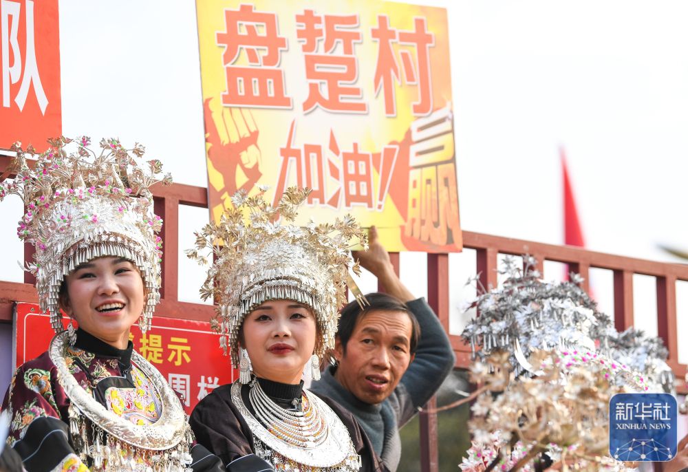 ↑榕江三中的學(xué)生在揭幕戰(zhàn)半場時間表演舞蹈《侗家姑娘》(無人機照片)。