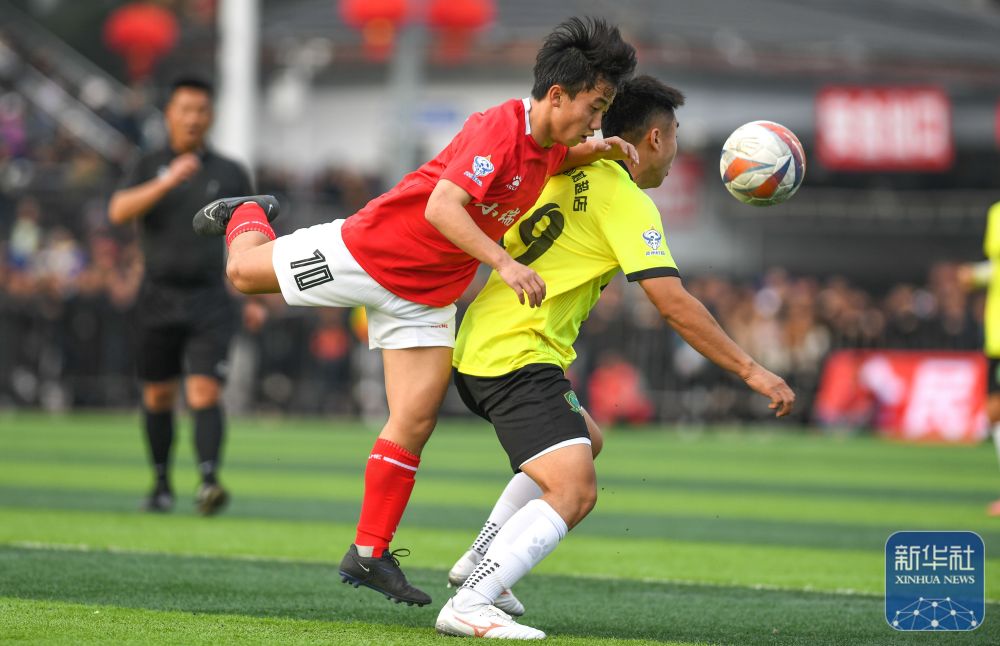 ↑小瑞村足球隊球員石龍(左)與盤踅村足球隊球員在揭幕戰(zhàn)比賽中。