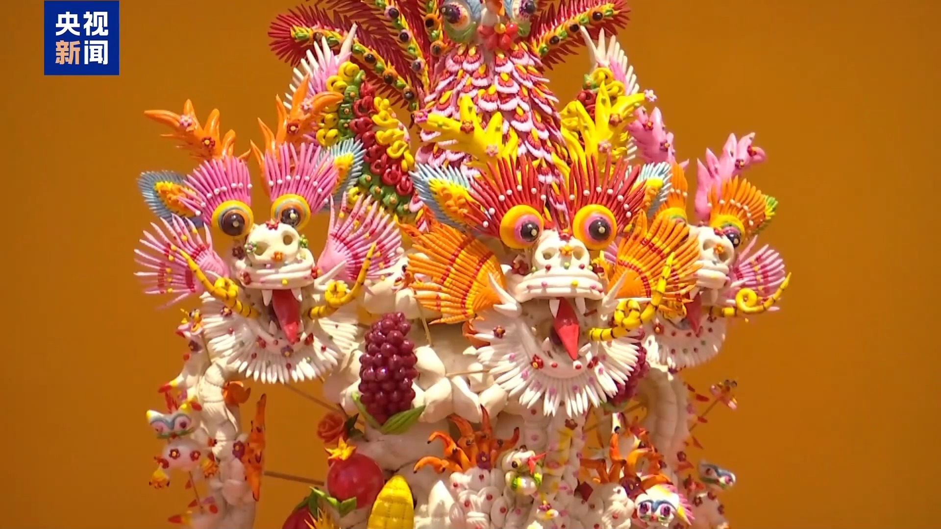 由地方非遺傳承人制作,傳統與創新兼具的面花作品《龍鳳棗山》,用搓、揉、編等10多道工序結合制作而成,吸引了不少觀眾駐足觀看。