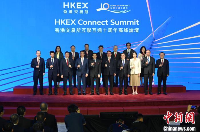 2024年11月18日,“香港交易所互聯互通十周年高峰論壇”在香港金融大會堂舉行。圖為嘉賓出席祝酒儀式。 中新社記者 李志華 攝