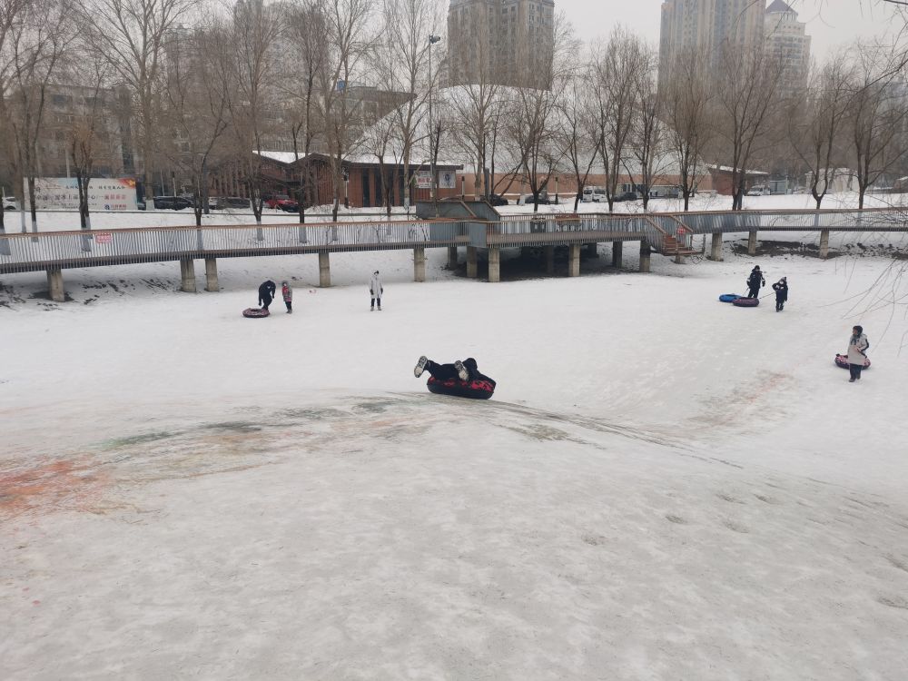在哈爾濱湘江公園,28日一早,10歲的黃梓天就和爸爸一起來玩雪圈。這處公園里形成的自然雪坡,每年冬季都成為市民滑雪圈的好去處?!霸缟虾⒆右獊?,就帶著過來玩一會,也是一種過年的方式?!秉S梓天的父親黃文說。