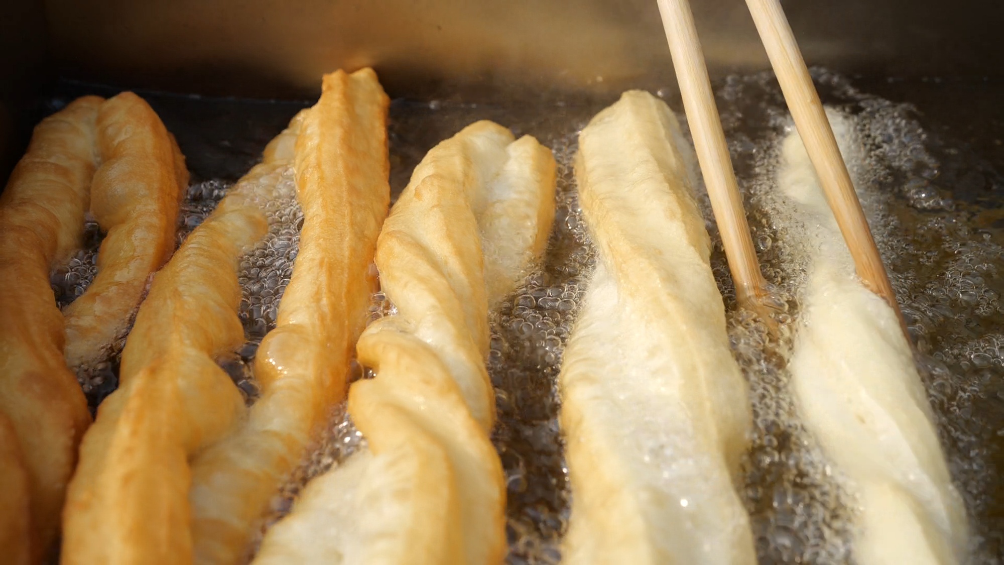 史梅菊賣早餐賣了二三十年,今年她和小叔子江新軍代表江莊村參賽。為防止面團(tuán)粘連,史梅菊用搟面杖在油鍋里沾點油后,再把面團(tuán)搟成長面餅狀。用刀快速切條,兩個面餅條疊在一起,史梅菊再用手摁壓幾下,給油條在鍋里留足發(fā)酵空間,以此保持油條的蓬松感。江新軍負(fù)責(zé)不停地翻轉(zhuǎn)鍋里的油條。