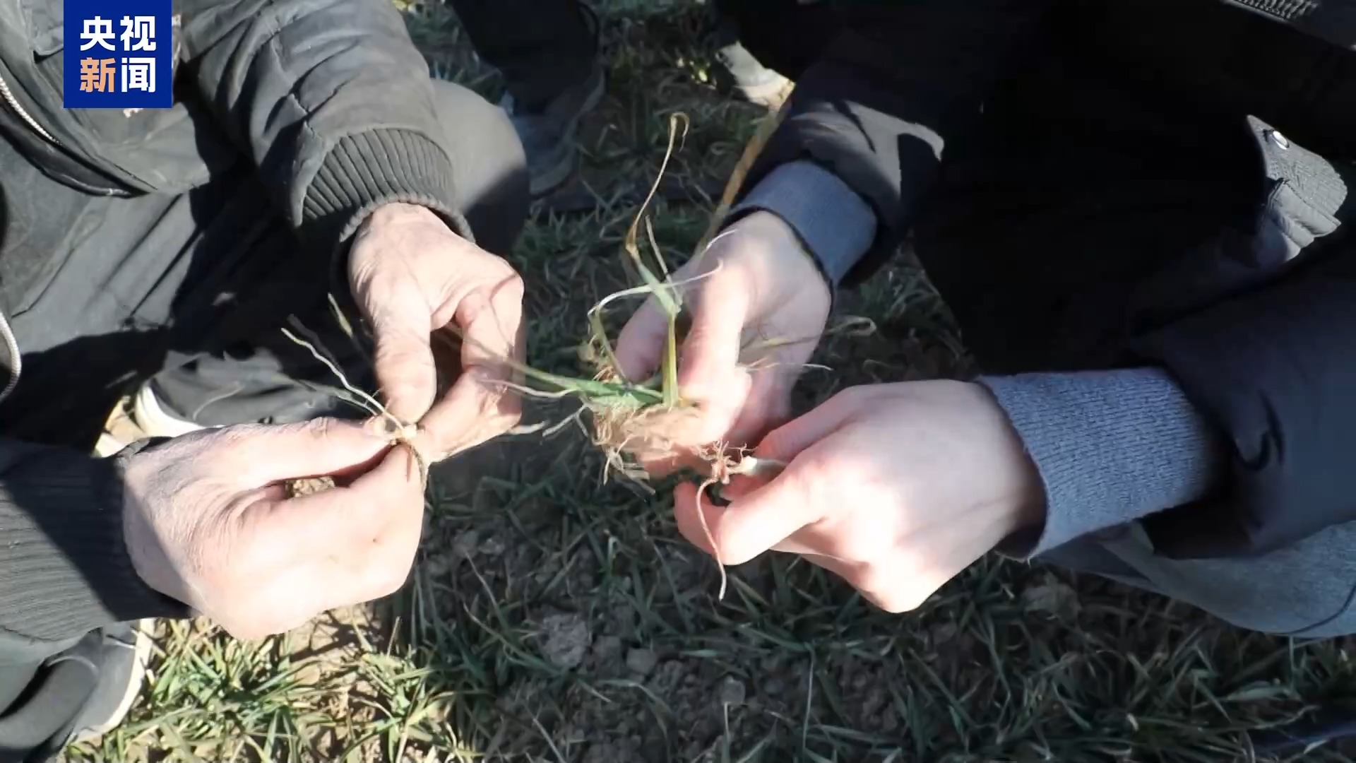 在山東煙臺招遠市一處麥田里,農技專家正仔細查看小麥的生長情況。