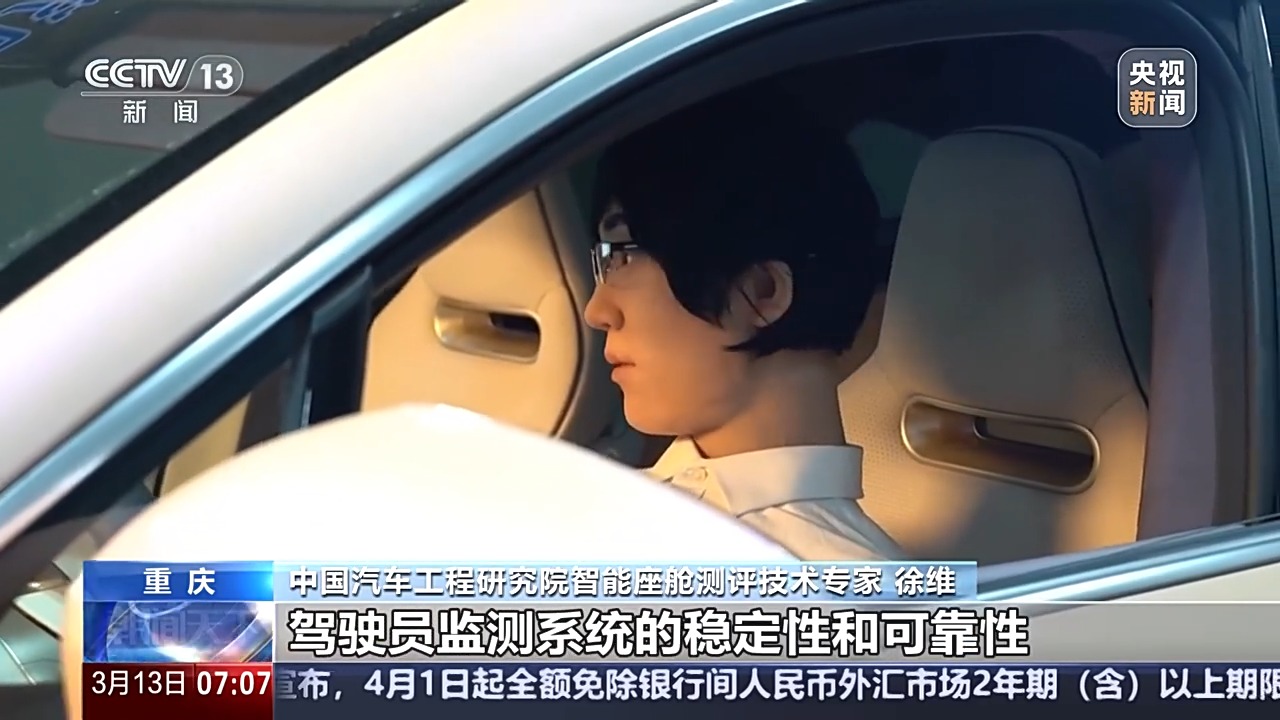 中國汽車工程研究院智能座艙測評技術專家 徐維:這個仿生機器人可以去模擬駕駛員的一些手勢動作,同時可以模擬我們眨眼睛、微笑等一些微表情,從而快速去檢測我們駕駛員監測系統的穩定性和可靠性。