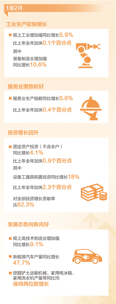 新型工業(yè)化穩(wěn)步推進(jìn),工業(yè)生產(chǎn)較快增長。1至2月,規(guī)模以上工業(yè)增加值同比增長5.9%,比上年全年加快0.1個百分點。其中,裝備制造業(yè)增加值同比增長10.6%,對工業(yè)增長支撐作用明顯。春節(jié)期間,假日經(jīng)濟(jì)活躍,帶動信息技術(shù)、旅游交通出行相關(guān)行業(yè)增長,服務(wù)業(yè)增勢較好。1至2月,服務(wù)業(yè)生產(chǎn)指數(shù)同比增長5.6%,比上年全年加快0.4個百分點。