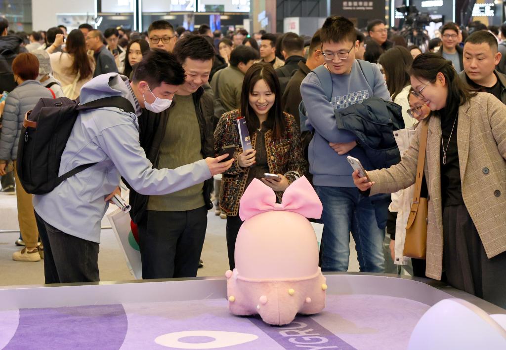 3月20日,參觀者在展會上與“Ai Me智能機器人”互動。當日,以“AI科技、AI生活”為主題的2025中國家電及消費電子博覽會(AWE2025)在上海新國際博覽中心開幕。本屆展會吸引全球千余家企業參展,全景展示家電及消費電子領域的前沿成果,呈現AI賦能智慧生活的新產品、新方案、新場景。(新華社記者 方喆 攝)