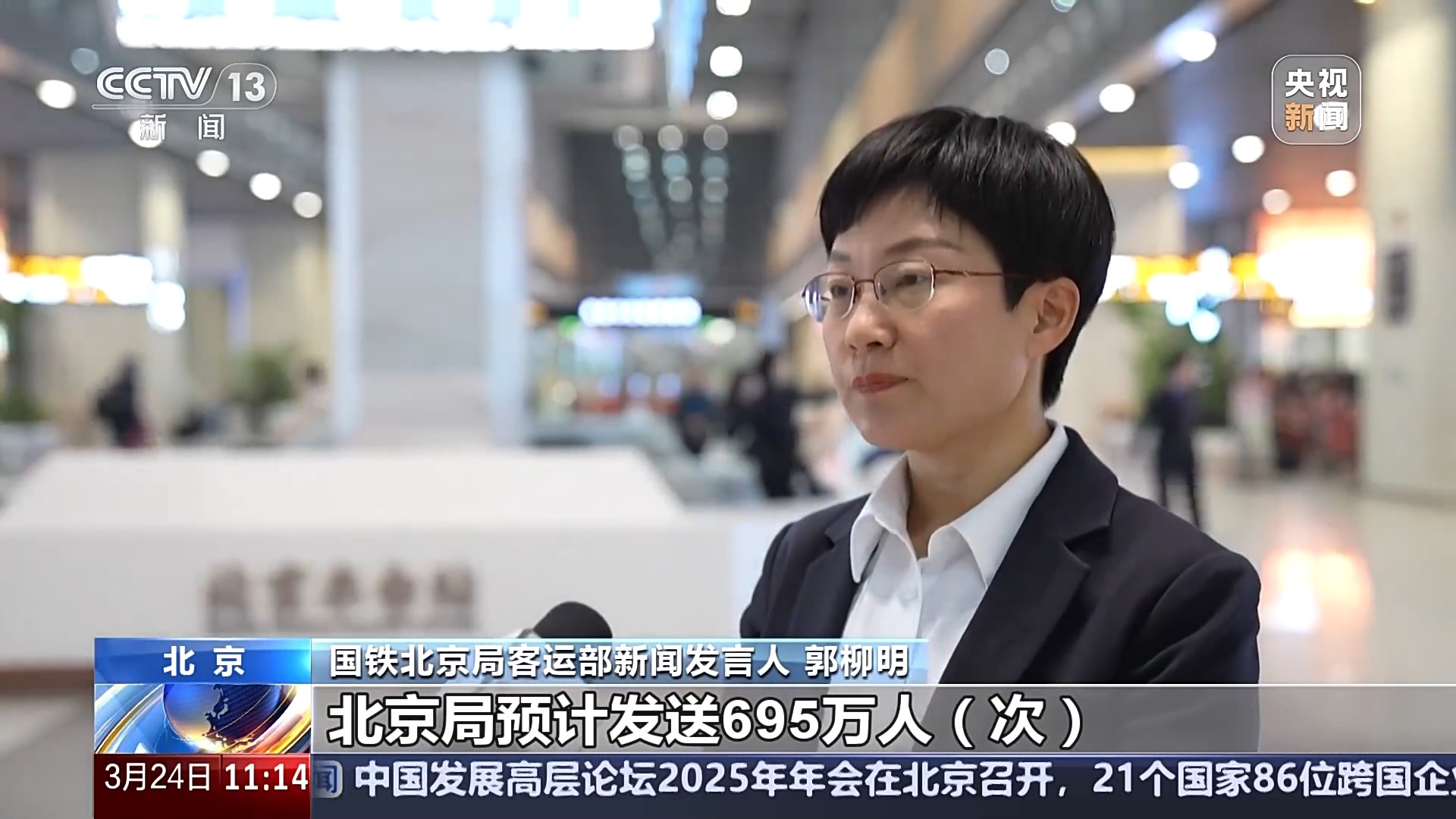 國鐵北京局客運部新聞發言人 郭柳明:清明運輸期間5天,北京局預計發送695萬人次,同比增幅4.6%。高峰日在4月4日,預計發送165萬人次??土髦饕性跐稀⑻?、鄭州、沈陽、青島、西安以及北京至天津、保定、石家莊、張家口往返間。