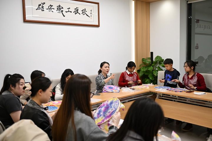 雄安新區(qū)職工夜校的學(xué)員在容東康寧雄觀書(shū)屋內(nèi)制作扎染(2025年3月14日攝)。新華社記者 牟宇 攝