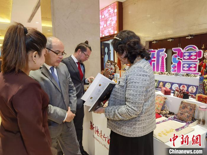 3月31日,新疆在北京舉辦有關國家駐華使節交流會,來自43個國家和國際組織的70位外賓出席。圖為外賓在新疆特色產品展區參觀。 中新社記者 徐雪瑩 攝