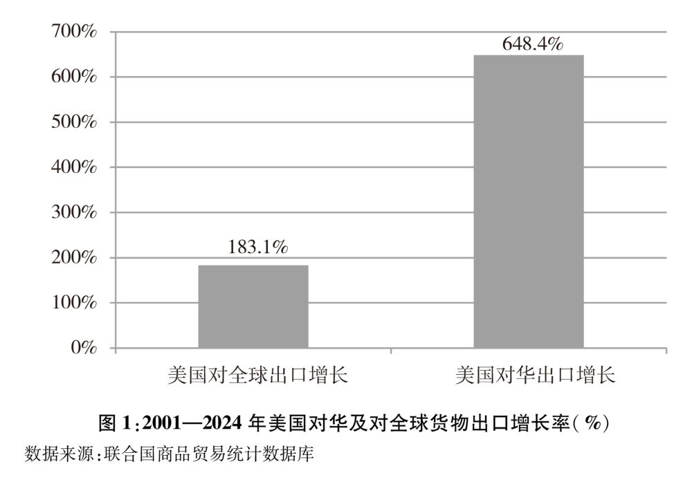 美國對華出口增速明顯快于其對全球出口。中國加入世界貿易組織以來,美國對華出口快速增長,中國成為美國重要的出口市場。根據聯合國統計數據,2024年美國對華貨物出口額1435.5億美元,較2001年的191.8億美元增長648.4%,遠遠高于同期美國對全球183.1%的出口增幅(圖1)。