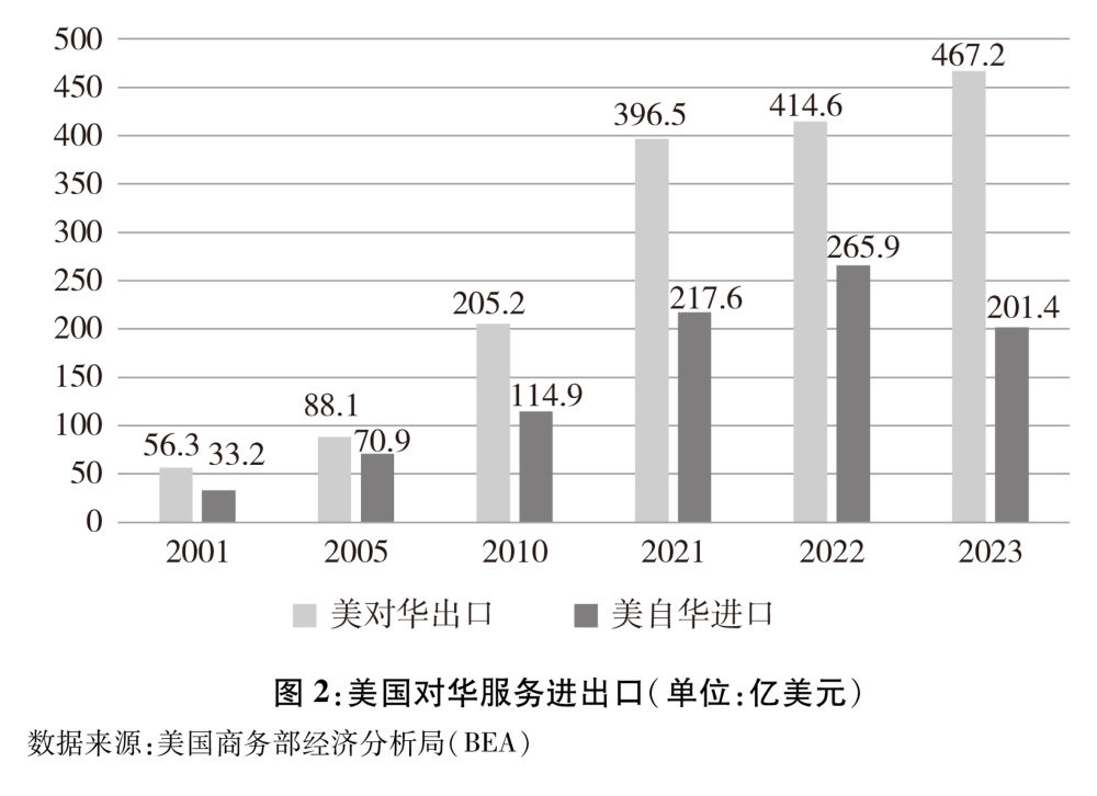 美國服務業產業門類齊全,具有較強國際競爭力。總體來看,隨著經濟不斷發展和人民生活水平提升,中國對服務需求明顯擴大,中美雙方服務貿易快速增長。據美國商務部統計,2001-2023年,中美服務貿易額由89.5億美元擴大到668.6億美元,增長了6倍(圖2)。根據中方統計,2023年,美國是中國第二大服務貿易伙伴;據美方統計,中國是美國第五大服務出口目的地。