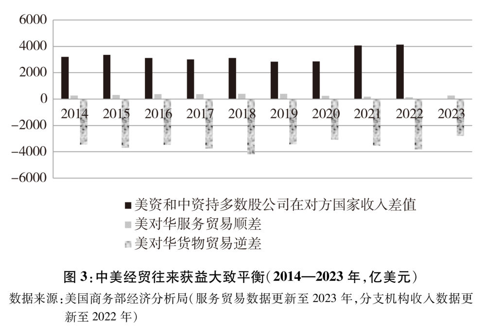 根據美國商務部數據,2023年美國對華服務貿易順差為265.7億美元,美國在服務貿易方面占有顯著優勢;2022年美資企業在華銷售額高達4905.2億美元,遠高于中資企業在美786.4億美元的銷售額,差額高達4118.8億美元,美國企業跨國經營優勢更為突出。