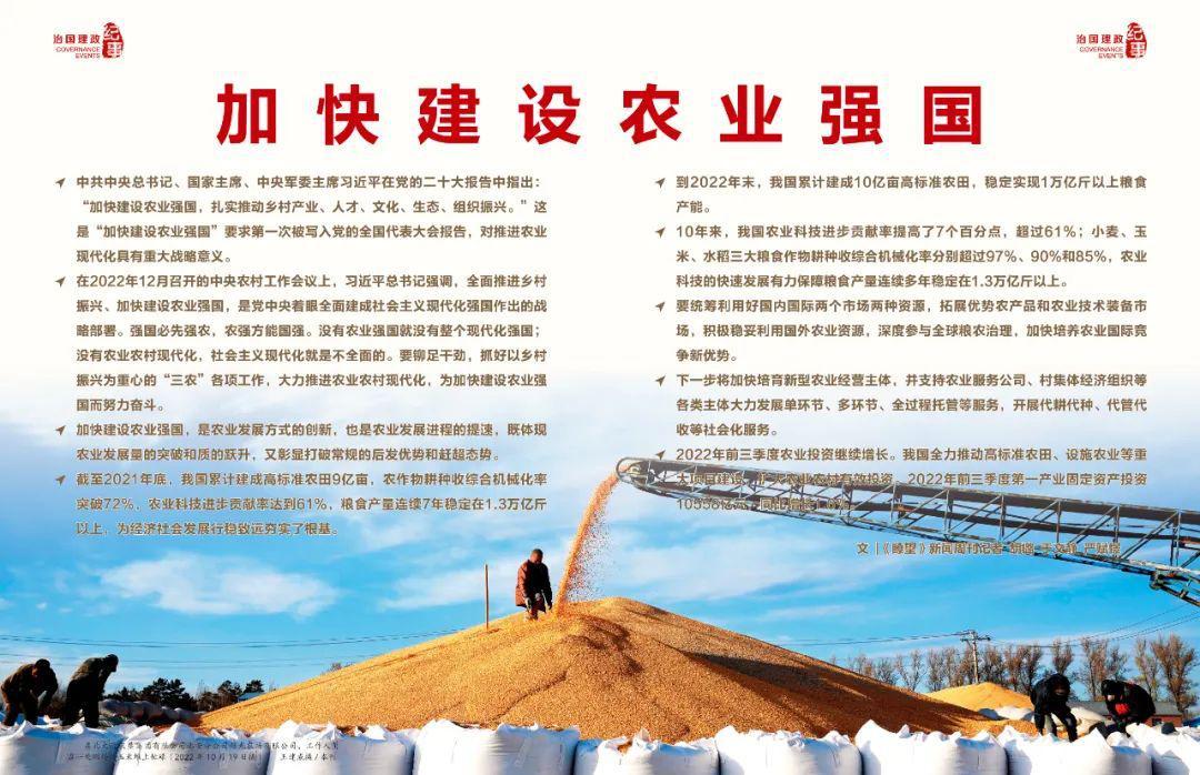 ◆ 中共中央總書記、國家主席、中央軍委主席習(xí)近平在黨的二十大報(bào)告中指出:“加快建設(shè)農(nóng)業(yè)強(qiáng)國,扎實(shí)推動(dòng)鄉(xiāng)村產(chǎn)業(yè)、人才、文化、生態(tài)、組織振興?!边@是“加快建設(shè)農(nóng)業(yè)強(qiáng)國”要求第一次被寫入黨的全國代表大會(huì)報(bào)告,對(duì)推進(jìn)農(nóng)業(yè)現(xiàn)代化具有重大戰(zhàn)略意義。