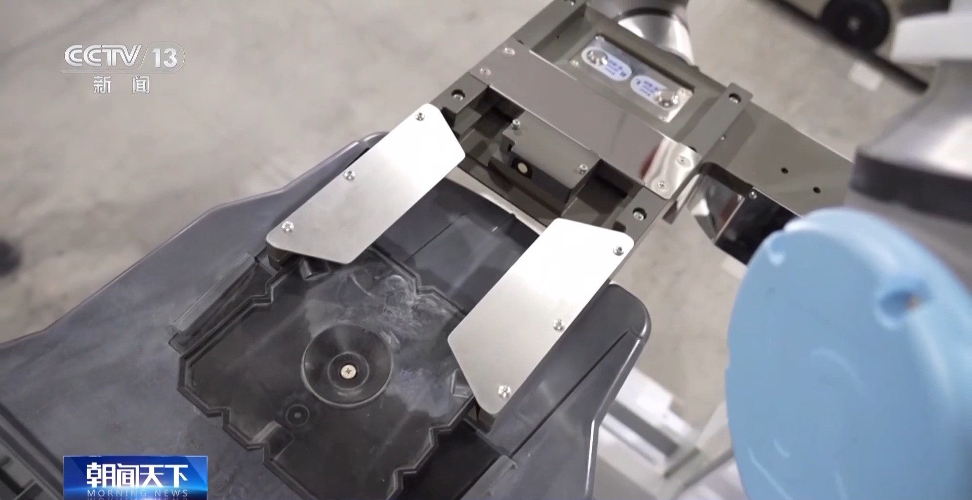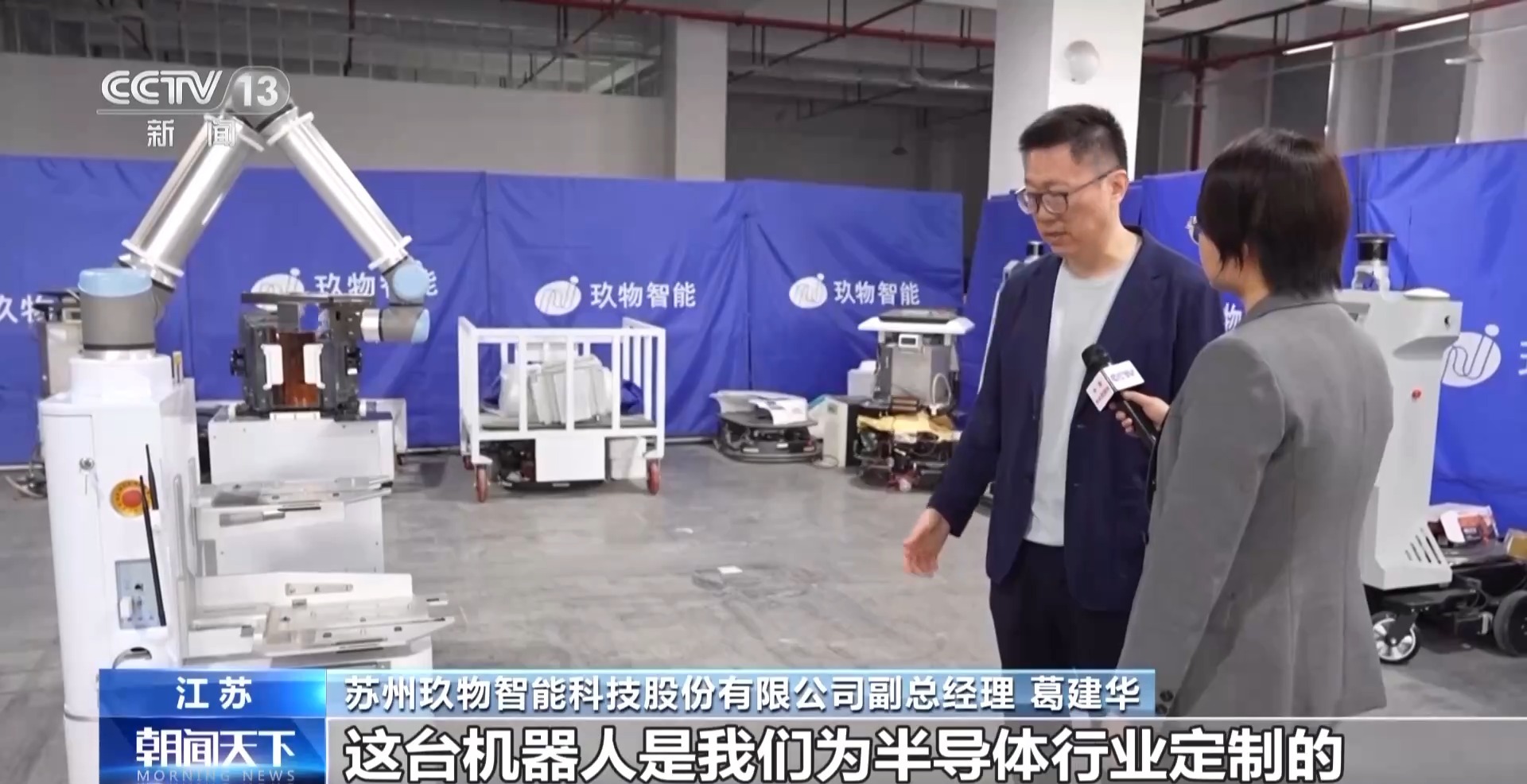 蘇州玖物智能科技股份有限公司副總經理 葛建華:這臺機器人是我們為半導體行業定制的。我們現在抓取的這個設備,其實是一臺晶圓盒,這個晶圓片模型其實特別薄、特別脆,震動稍微厲害一點就會有裂痕,機械臂的精度可以達到0.1毫米。