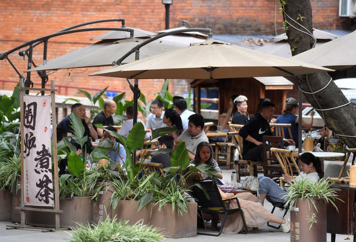 4月16日,消費者在重慶市九龍坡區謝家灣街道民主村社區一茶飲店休閑。周邦靜攝