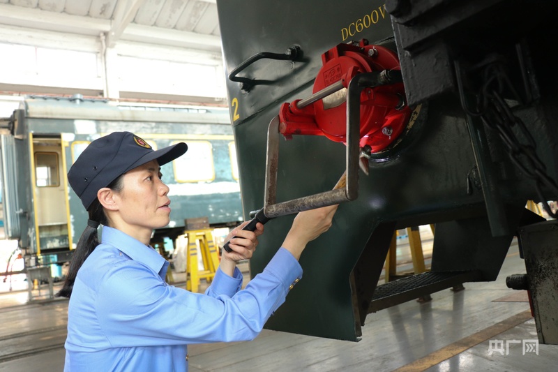 吳園梅正在檢修車(chē)輛(央廣網(wǎng)記者 劉培俊 攝)