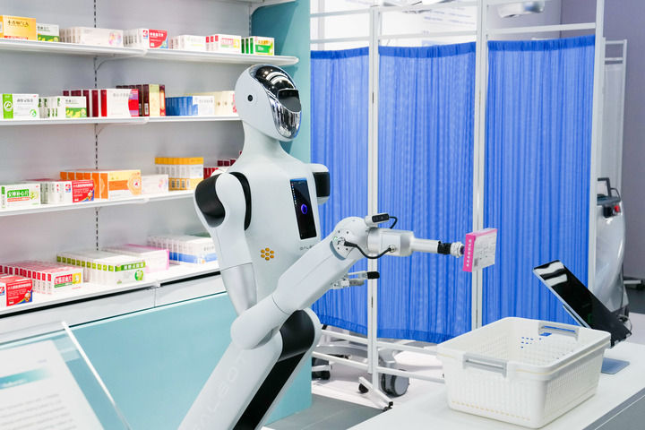 2025年2月24日,在北京“機器人大世界”的應用場景示范區,銀河通用機器人進行藥店無人值守場景演示。