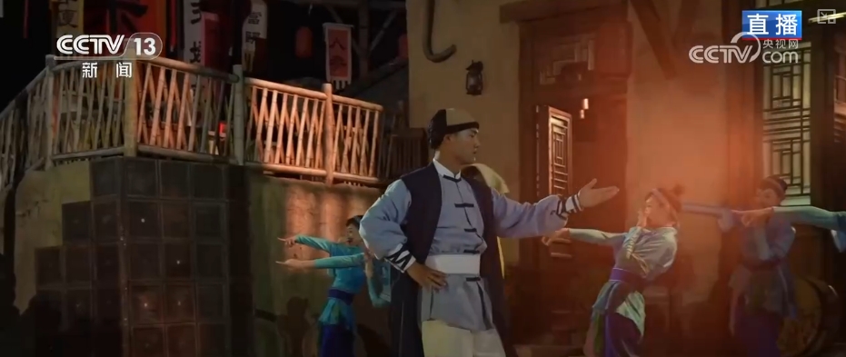 實(shí)際上,這處街道只是整場(chǎng)演出中的一幕。游客隨演員一路向前,長達(dá)1個(gè)小時(shí)的劇情講述了百年前一名外國導(dǎo)演來到鄭州,尋找太極的故事。其間,會(huì)串聯(lián)起景區(qū)的不同場(chǎng)景,比如走過繁華的“老鄭州”街道,后面就變成了一個(gè)古樸的村落。置景取材于太極拳發(fā)源地之一的河南焦作陳家溝,村里既有講述拜師學(xué)藝故事的情景劇,又有以太極功夫編排的舞蹈表演,體現(xiàn)出中原地區(qū)的多樣歷史文化。