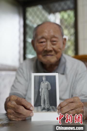 2018年5月21日,安徽合肥籍臺灣老兵金英在臺灣屏東家中為《日暮·歸鄉》劇組展示老照片。(片方供圖)