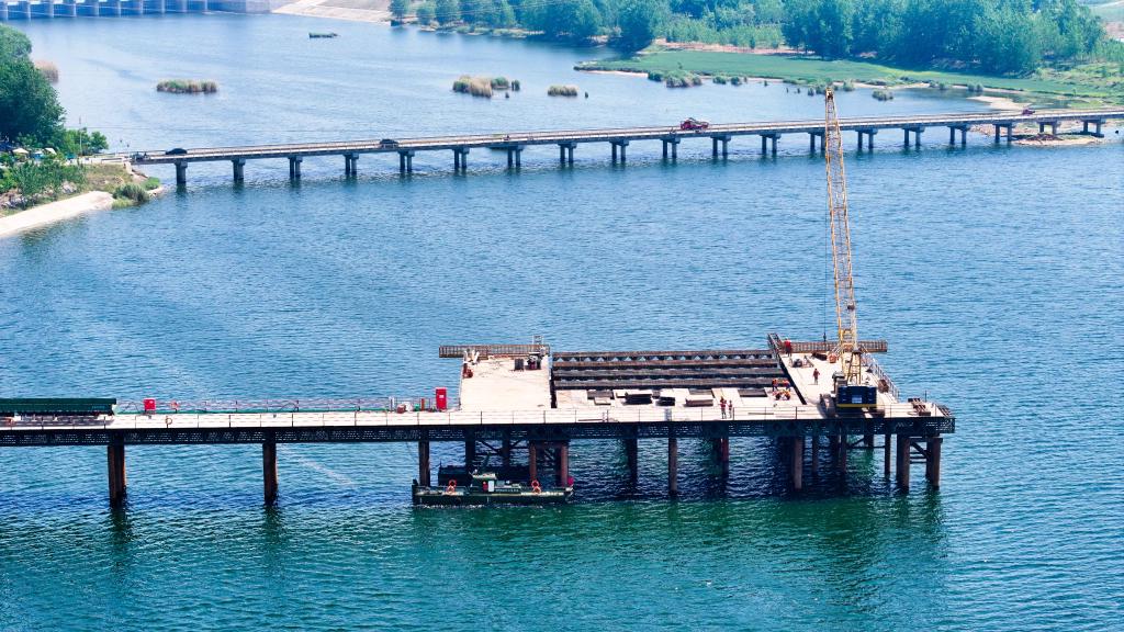 國家重點項目濰(坊)宿(遷)高速鐵路項目承建方正搶抓工期與節點,穩步推進標段施工。4月30日,在濰宿高鐵山東郯城段,中鐵上海局的工作人員在進行沭河特大橋施工(無人機照片)。新華社記者 郭緒雷 攝
