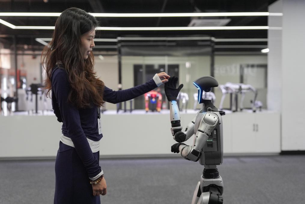 4月23日,在知名機器人公司杭州宇樹科技展廳內,宇樹人形機器人G1展示模仿動漫角色奧特曼的“光波”動作。 新華社記者 黃宗治 攝