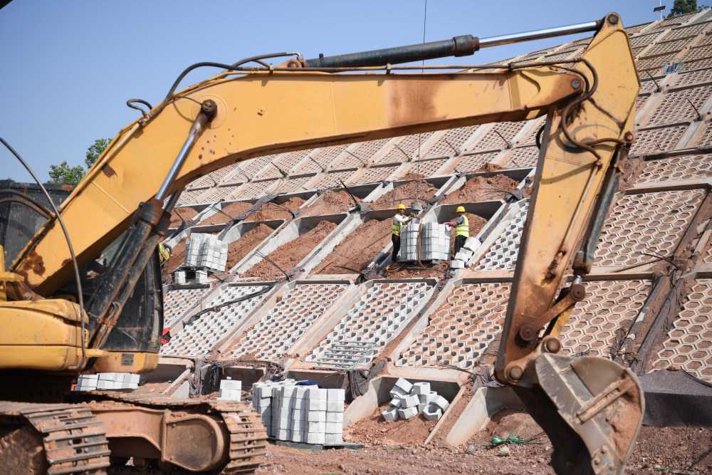 4月25日,中鐵十一局工人在合武高鐵安徽段金葉隧道口進(jìn)行邊坡施工。新華社記者 劉軍喜 攝
