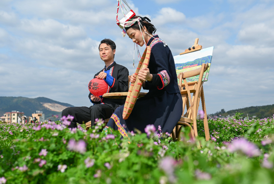 2025年3月16日,新人在廣東河源市東源縣柳城鎮的紫云英花海中婚拍留念。新華社記者 肖恩楠 攝