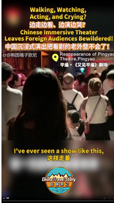 在西安《駝鈴傳奇》中,親歷“狼群”環(huán)伺的震撼冒險(xiǎn);走進(jìn)《又見平遙》,踩著青磚“卷入”晉商江湖;去鄭州“只有河南·戲劇幻城”,回到“教室”重拾青春記憶……“感覺到電影里面啦”“太壯觀了”,觀看這些中國(guó)沉浸式演出的老外們上一秒還在咧嘴大笑,下一秒就哭成了淚人。