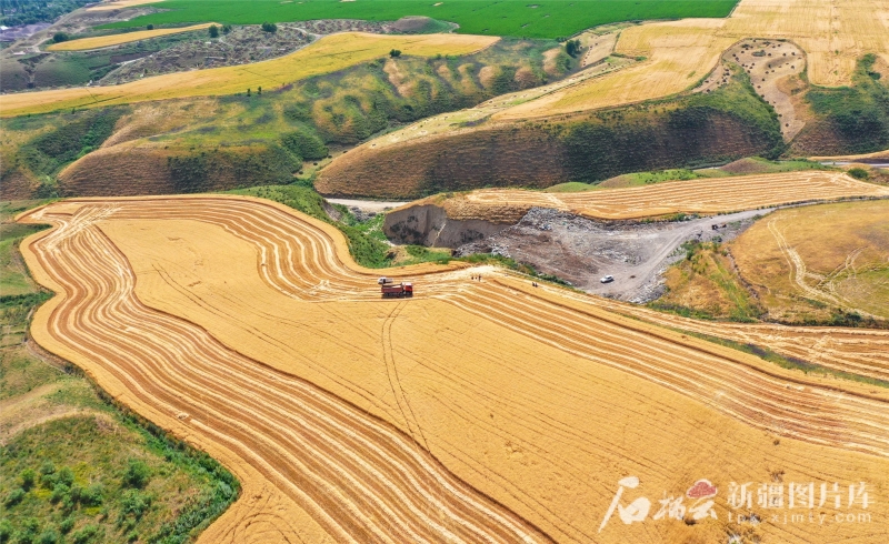 2024年6月24日,在新源縣則克臺鎮則克臺村的麥田里,隨著大型收割機駛過,麥穗、秸稈有序分離,一顆顆麥粒從收割機出料口傾瀉而下,裝進運糧車里。張文庭攝