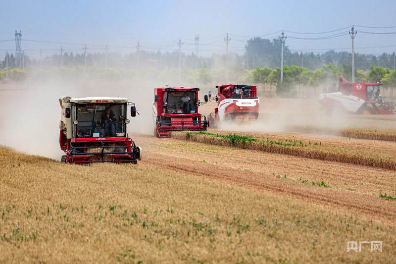 種糧大戶張洪文的4臺聯合收割機開足馬力馳騁在麥田里(央廣網發 王建安 攝)