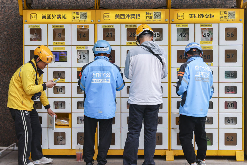 2025年4月22日,江蘇省南京市,外賣員在智能外賣柜前投放餐品。新華社發(史俊攝)