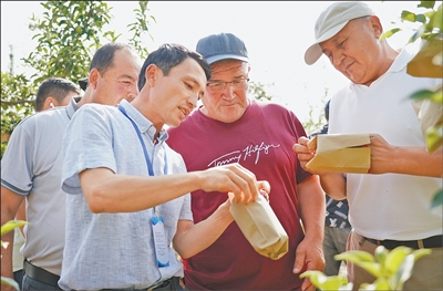近日,2025年首期中國—中亞五國職業農民培訓班在陜西渭南開班。圖為學員們在西北農林科技大學蘋果試驗站了解蘋果套袋知識。